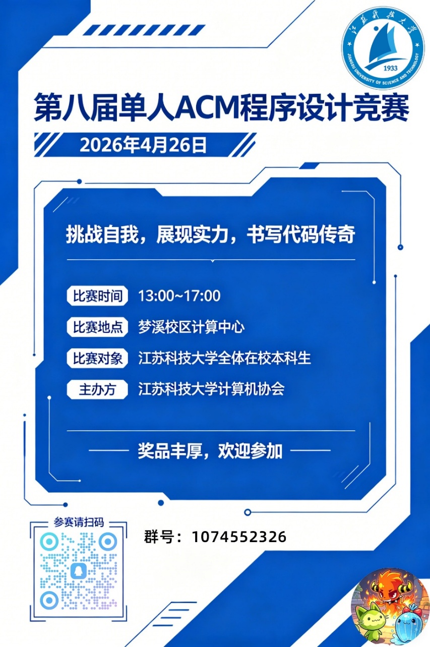 大家好,一年一度的单人ACM程序设计大赛即将到来,欢迎各位同学报名参加!